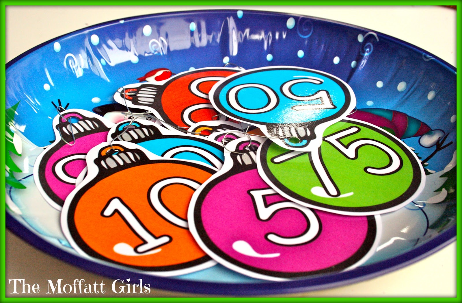 We started off with the math center that worked on counting by 5’s. Audrey was thrilled when she saw the Christmas ornaments ready for her to hang up! I simply cut out the ornaments from our 10 Math Centers pack, hole punched the bulbs and attached a wire ornament hanger…just like real Christmas ornaments!