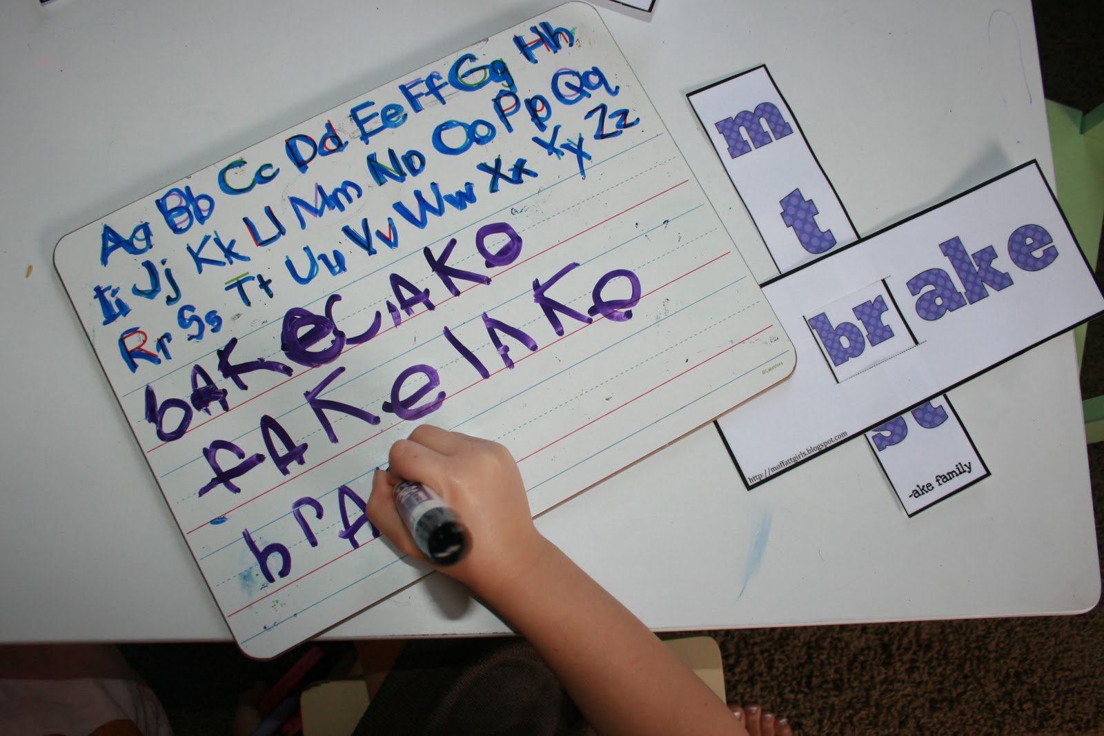 I have Audrey write the words as she slides them. I can hear her sound out each beginning sound as she makes new words…
