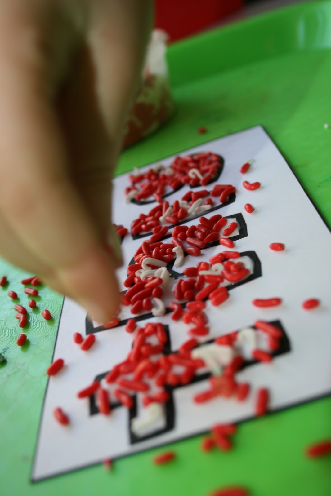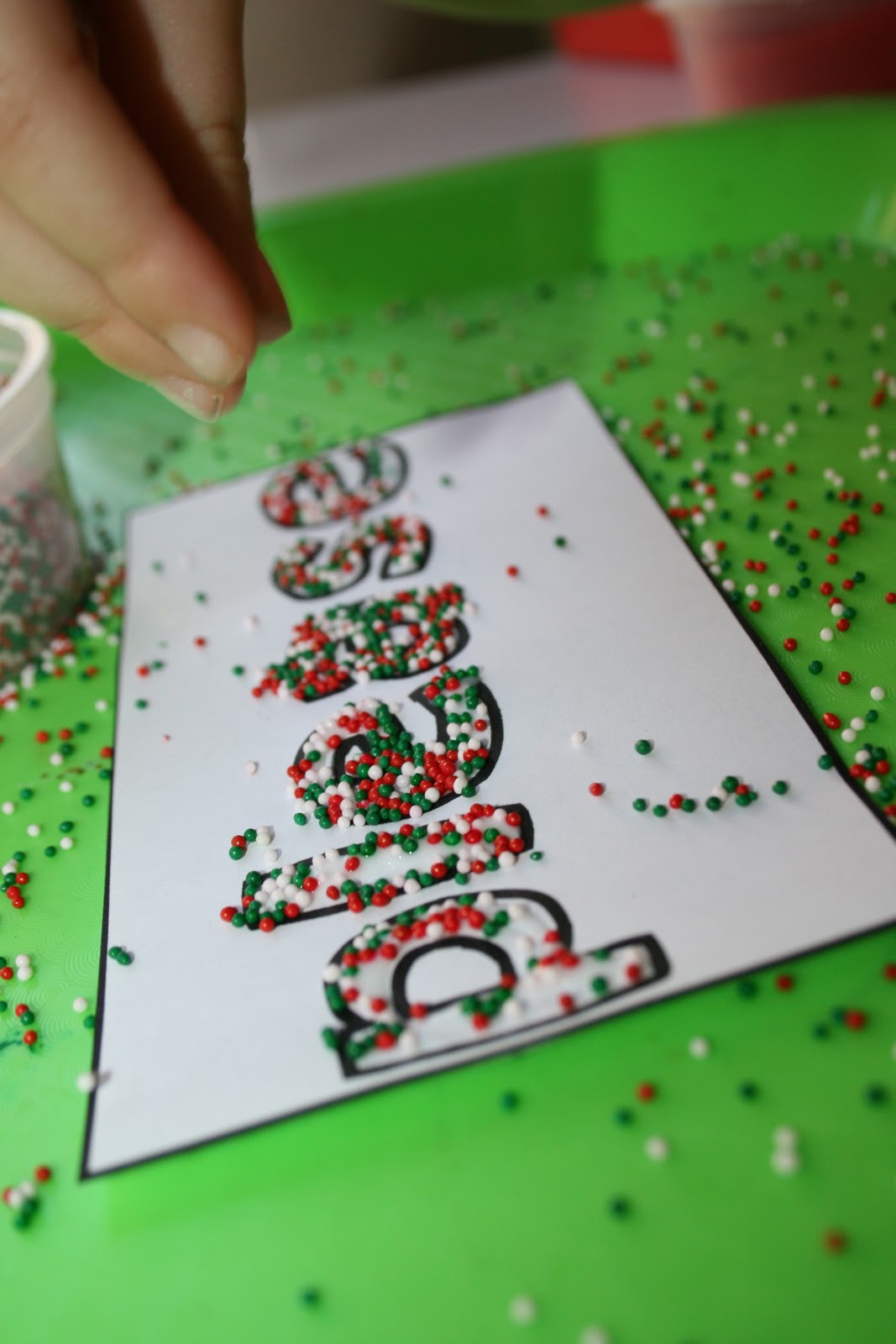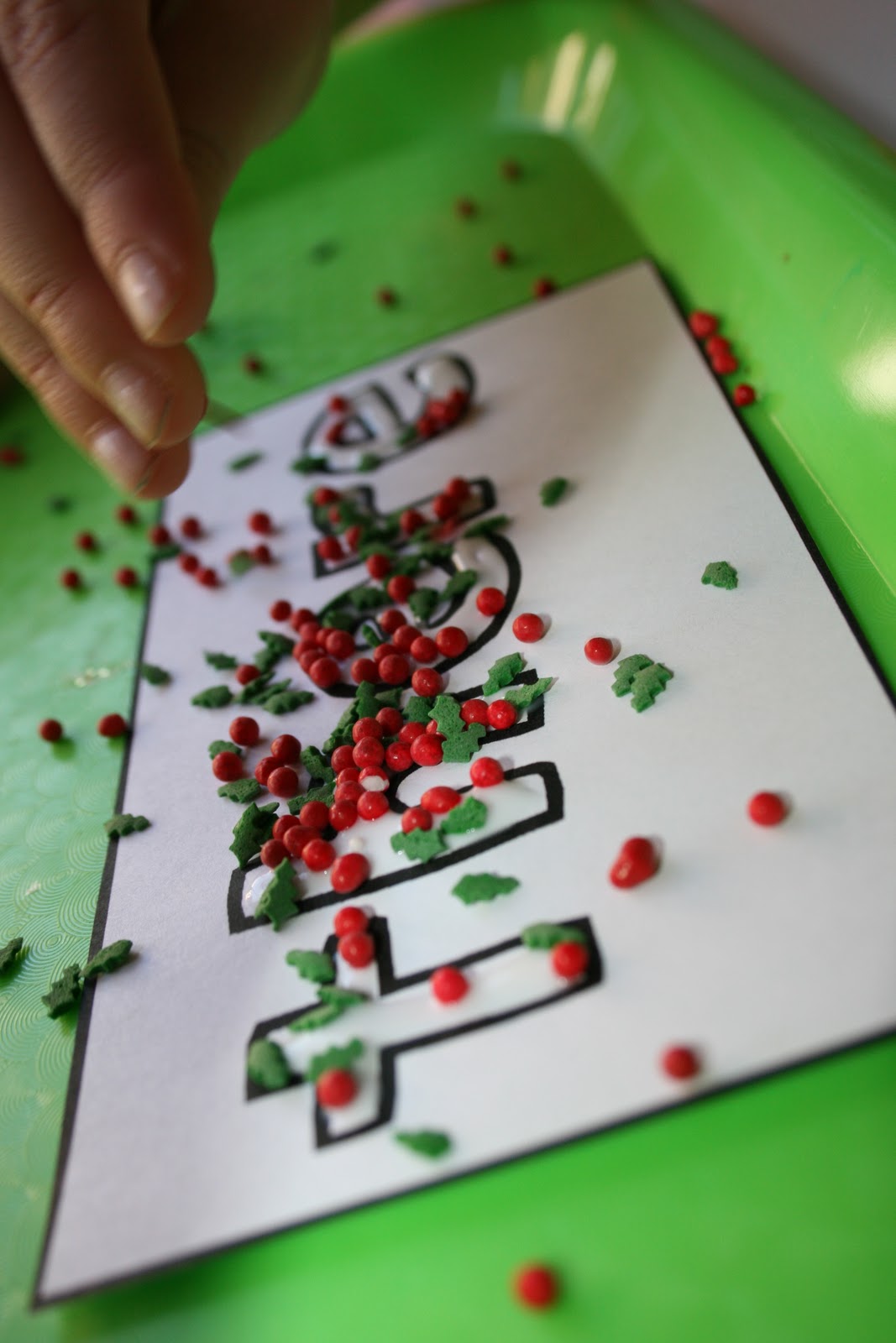 Since we worked on our sight words during the Christmas season, we decorated them with these adorable Christmas cake decorations. We also used glitter! The only issue that I have with this part of the program is how to stop the girls from eating the cake decorations:)