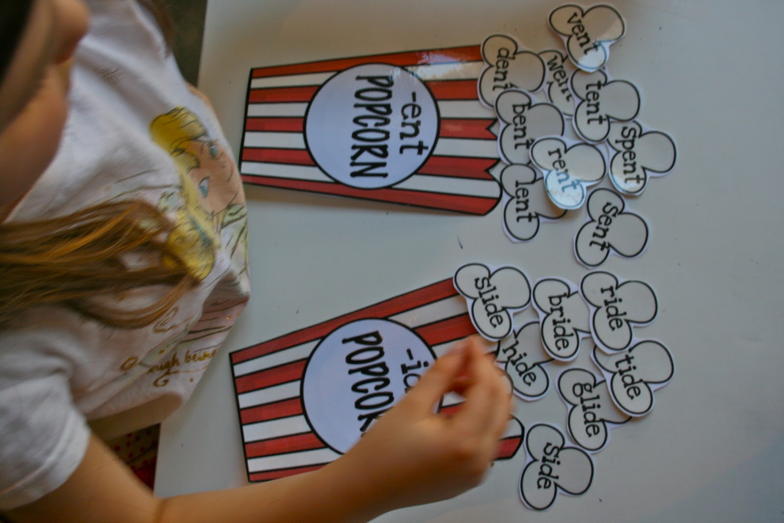 I LOVE our word sort this week and so did Audrey! You have two popcorn containers and you place the correct piece of popcorn in each popcorn bag! How cute is that? You can extend this activity by printing two copies of the popcorn and play the game memory. You just want to make sure that they are reading each piece of popcorn correctly.